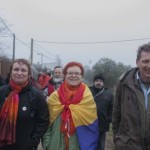 Der Samstagmorgen begann diesig, mit 3 Bussen fuhren wir zum Jarama-Tal. Gemeinsam mit ca. 600 Teilnehmern, darunter vielen Jugendlichen, machten wir uns auf den beschwerlichen Weg, der Schlamm klebte hartnäckig an den Schuhen. Zwischendurch wurde der Front- und Schlachtverlauf vorgestellt, und der seit kurzem bestehende Chor der AABI stimmte bekannte Lieder – Spaniens Himmel, Jarama Valley und den Marsch der Interbrigaden – auf spanisch, deutsch und englisch an. Unterwegs gab es Gelegenheit zu vielen Gesprächen zwischen den Generationen und natürlich international, sogar mit Freunden, angereist aus Australien. Dabei konnten wir auch unseren ¡NO PASARÁN! weitergeben, u. a. an Jugendliche mit der Fahne der Lugansker Republik, die vor kurzem in der Ukraine waren. Sie berichteten von der Gründung internationaler Brigaden dort, von der Notwendigkeit der internationalen Solidarität mit der Bevölkerung. Ich erzählte von meinem Besuch in Donezk, vor 30 Jahren, als Studenten-Singegruppe waren wir auf Tour durch heutiges Kriegsgebiet, haben Konzerte für Bergarbeiter gegeben. Auch 70 Jahre nach dem Ende des 2. Weltkrieges ist der Frieden keine Selbstverständlichkeit!