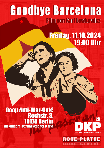Posted on Monday January 12th, 2026Monday January 12th, 2026 by « All Events This event has passed. (Deutsch) Goodbye Barcelona im Anti War Cafe 11. October 2024, 21:00 - 12. October 2024, 1:00 « (Deutsch) Großkundgebung in Berlin am 3. Oktober 2024 (Deutsch) Spanien-Treff März – Filmnachmittag und Gespräch » Sorry, this entry is only available in Deutsch. Add to calendar Google Calendar iCalendar Outlook 365 Outlook Live Details Start: 11. October 2024, 21:00 End: 12. October 2024, 1:00 Event Categories: [:de]KFSR-Veranstaltungen[:], Venue Anti War Café Rochstr. 3 Berlin, Berlin 10178 + Google Map Organizers KFSR 1936 – 1939 e. V. UZ / DKP
