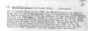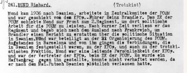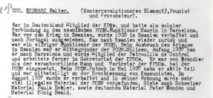 Eine schmähliche Rolle in der POUM-Affäre hatte die im republikanischen Spanien im Geheimen wirkende „Abteilung Abwehr und Gegnerarbeit der KPD“ gespielt. Sie nutzte ihre Kenntnisse über deutsche oppositionelle Kommunisten, Linkssozialisten und Anarchosyndikalisten, die in Spanien aktiv waren und den Ausländersektionen des POUM und der CNT angehörten. Für den POUM waren das neben später bekannteren Personen wie Willy Brandt, Peter Blachstein, Max Diamant und Siegmund Neumann z.B. Walter Schwarz [3], Richard Monden [4], Ewald König, Karl Breuning, Waldemar Bolze, Kuno Brandel , Else Homberger, Hans Sittig, Eva Laufer, Gisela Wintergerst, Charlotte Margolin, Ernst Steinhoff, Gustav Weitguß, Erika und Hubert Giepen, Richard Durban, Ernst Galanty (d.i. Isidor Klappholz)und andere mehr. Viele dieser Deutschen gehörten dem von Hans Reiter kommandierten Bataillon „Choque“ der Lenin-Division des POUM an und waren nach der Auflösung dieser Division verhaftet worden. Der Verhaftungswelle fielen auch Frauen zum Opfer. Da alle die Verhafteten der Sozialistischen Arbeiterpartei (SAP) oder der KPD(O) angehörten, waren sie schon deshalb der KPD verhasst. Diese verschwieg ihre Genugtuung nicht, dass diese Personen in der Regel von der republikanischen Geheimpolizei verhaftet wurden oder die nächstbeste Gelegenheit nutzen mussten, um Spanien zu verlassen. [5] Da die KPD in Spanien selbstverständlich die stalinistische Charakterisierung des POUM als „trotzkistisch-faschistisch“ übernahm, musste es sich in ihrem Verfolgungs- und Klassifizierungswahn verheerend auswirken, wenn sie den POUM als die „spanische SAP“ bezeichnete. [6] Waren die SAP und der POUM Mitglieder des „Londoner Büros“, des internationalen Zusammenschlusses linkssozialistischer Parteien, so gehörte die KPD(O) der Internationalen Vereinten Kommunistischen Opposition an. Obwohl es zwischen ihnen oft taktische Differenzen gab, waren sowohl SAP- als auch KPD(O)-Mitglieder Angehörige der Ausländersektion des POUM.