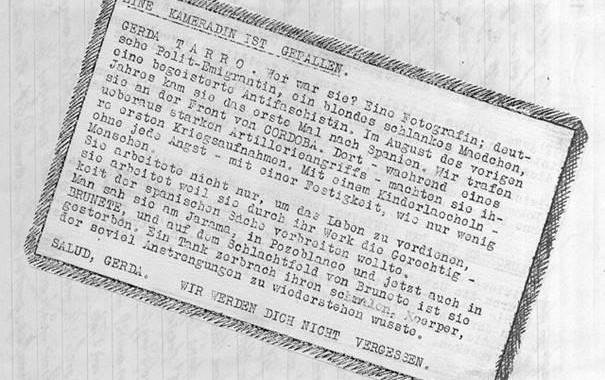 Gerda Taro berichtete während des Spanischen Krieges 1936-1939 von der Aragon-Front und von der Zaragosa-Offensive, von den Kämpfen bei Córdoba und Toledo. Sie wurde am 25. Juni 1937 von einem republikanischen Panzer überrollt und verstarb am Morgen des 26. Juli 1937. Man überführte ihren Leichnam nach Paris, wo am 1. August 1937 eine überwältigende Trauerfeier unter Teilnahme zahlreicher Emigranten, Künstler und Intellektueller stattfand. Die Beisetzung erfolge auf dem Pariser Friedhof Père Lachaise.