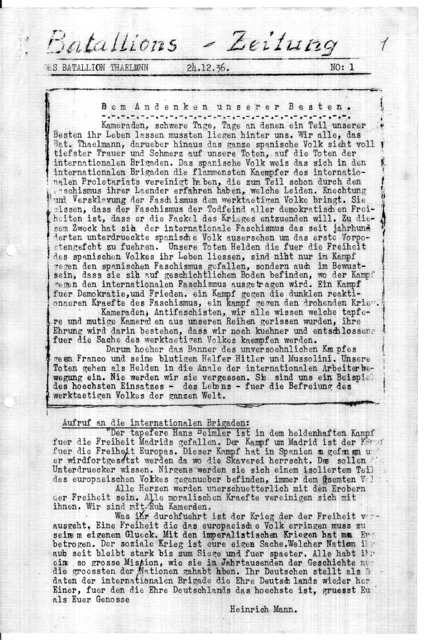 Fundstück: Batallions-Zeitung DES BATALLION THAELMANN – 24.12.36. NO: 1 – „Beim Andenken unserer Besten.“ u. „Aufruf an die internationalen Brigaden: Veröffentlicht am: Freitag, der 23. Dezember 2016Donnerstag, der 21. Juni 2018 von Redaktion KFSR Quelle: Archiv, Werner Abel. (AWA) Redaktion KFSR