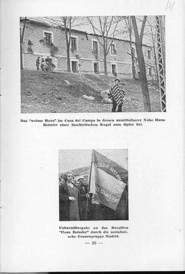 Es war eine bewegende Manifestation, die im Hause der Interbrigaden in der Calle Velazques 63 in Madrid stattfand. Wie auch schon ein Jahr zuvor bei der Totenfeier für Hans Beimler in Madrid hielt auch dieses Mal Francisco Antón, jüngstes Politbüromitglied der KP Spaniens und nunmehr Kriegskommissar der Volksarmee, die Laudatio für den Gefallenen. General José Miaja, der Chef der Zentrumsarmee, schickte vertreten durch den Capitán José Maria Estrugo eine Grußbotschaft. Es sprachen Rafael Henche, Bürgermeister von Madrid, der Sozialist Antonio Trigo Mairal, Zivilgouverneur der Region Madrid und viele andere. Bedauert wurde, dass das Hans-Beimler-Bataillon der 11. Brigade nicht teilnehmen konnte, weil es in der ersten Frontlinie lag und dort dringend gebraucht wurde. Für seine Kameraden sprach aber Heinz Roth (Heinz Hoffmann), der verwundete Kriegskommissar des Beimler-Bataillons mit den Worten: „Hans Beimler hat mit seinem Blut einen Teil der großen Schande abgewaschen, die der Volksverderber Adolf Hitler durch seine kriegerische Intervention in Spanien auf das deutsche Volk abgewälzt hat.“