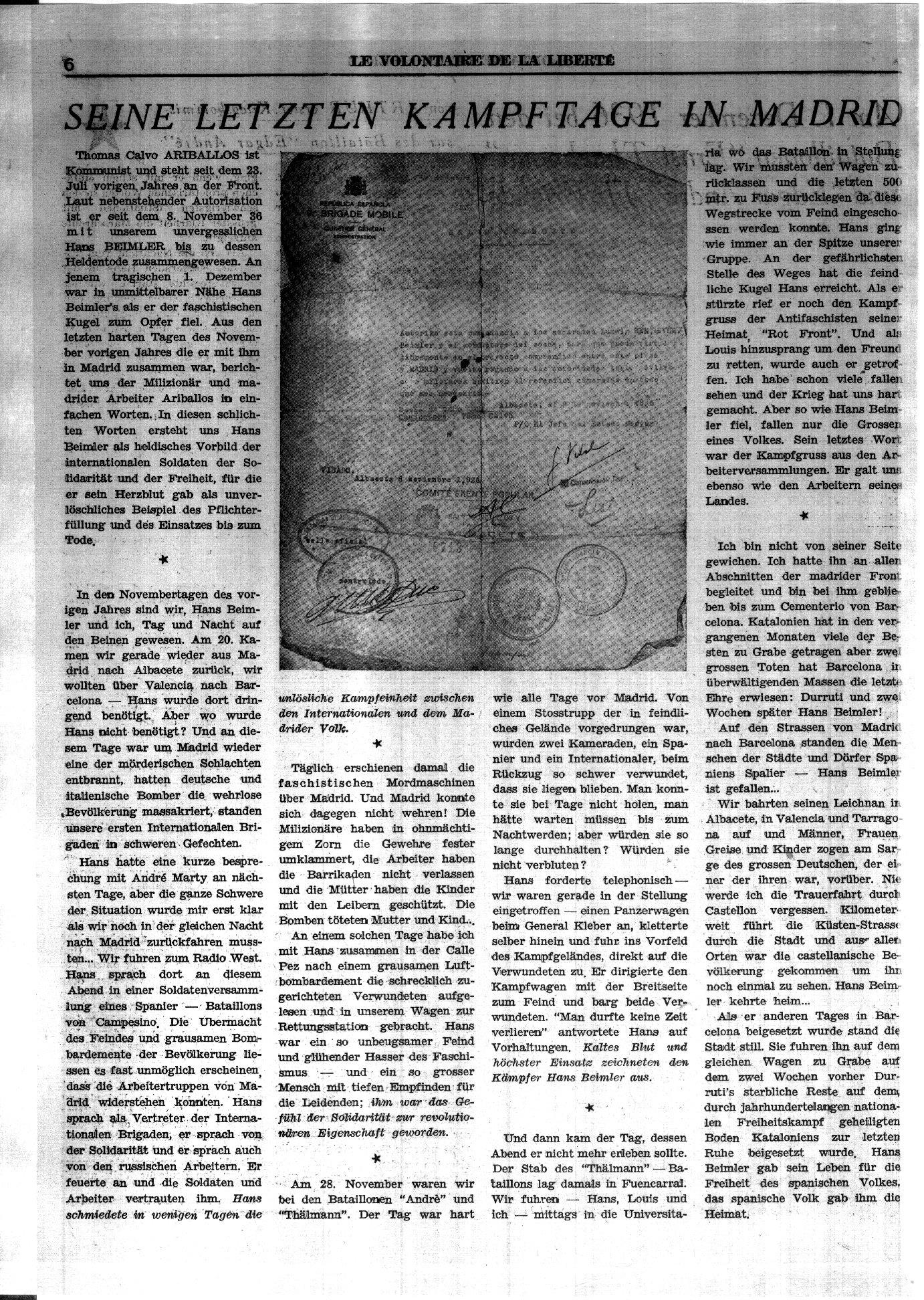 Der Autor des Artikels ist sehr daran interessiert zu erfahren, was aus Max Gayer, dem Dolmetscher des KPD-Reichstagsabgeordneten Hans Beimler nach seiner Freilassung im Oktober 1937 wurde. Als sensationell kann bezeichnet werden, dass der Fremdenpass [Faksimele am Ende des Beitrags] Gayers erhalten geblieben ist. Angefügt wird ebenso eine Kopie des Ersten Verhöhrs von Max Gayer nach seiner Verhaftung am 3. September 1937, geführt am 4. September 1937 in Barcelona sowie eine Erklärung Gayers zu den Umständen des Todes von Hans Beimler verfasst am 7. September 1937 in Barcelona.