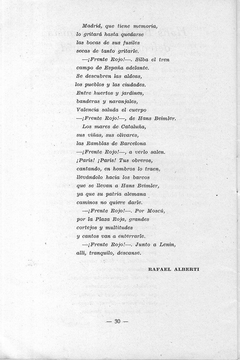 - Deutsche Nachdichtung des Gedichtes von Rafael Alberti. Quelle: Broschüre „Madrid ehrt Hans Beimler“. Quelle: Archiv Werner Abel (AWA).