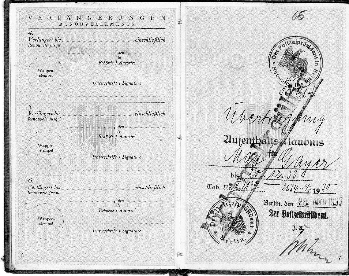 Natürlich stieß Antonia Stern bei ihren Recherchen auch auf Max Gayer, den Dolmetscher Beimlers, der auch bei den Fahrten mit Peter Merin dabei war. Gayer, geboren 1903 in Pulkavy in Polen in einer jüdischen Familie, hatte ein wahrhaft wechselhaftes Leben hinter sich. Weil er nicht in der polnischen Armee dienen wollte, hatte er das Land verlassen und, nie sehr erfolgreich, in Lateinamerika und Westeuropa gelebt. Als er 1935 nach Spanien kam, hatte er nicht nur einen auf dem Schwarzmarkt in Prag erstandenen tschechischen Pass, sondern auch einen noch gültigen deutschen Fremdenpass, in dem, im Namen des Polizeipräsidenten von Berlin ausgestellt, der Vorname „Max“ durchgestrichen und durch „Mendel“ ersetzt worden war. Dieser Fremdenpass, der in den Akten erhalten geblieben ist, weckte in Spanien den Verdacht, er sei Gestapo-Agent gewesen. Durch die Heirat mit einer Deutschen bekam er 1926 die Aufenthaltsgenehmigung für Deutschland und lebte hier bis 1935 als selbständiger Schneider. Die KPD-Abwehr unterstellte ihm später, er habe bei einem Verhör erzählt, dass er in Deutschland als Zuhälter gearbeitet hatte, aber dem Druck der „arischen“ Zuhälter nicht mehr gewachsen war. Es lässt sich nicht mehr nachprüfen, ob diese Aussage eine nachträgliche Fälschung der KPD-Abwehr war. Auf jeden Fall hatte sich Gayer von seiner Familie getrennt und lebte dann mit seiner Freundin Irene Schulze zusammen, die nach dem Tod ihres Vaters dessen Haus verkaufte. Mit diesem Geld kamen beide nach Spanien und gründeten einen Pelzhandel, bei dem Gayer so schwer betrogen wurde, dass er das Geschäft aufgeben musste.
