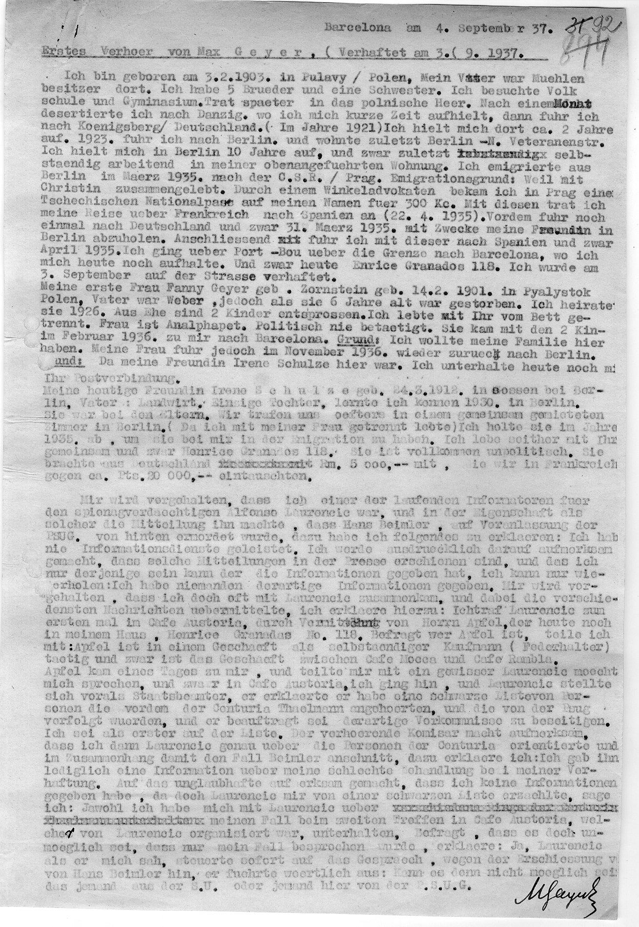 Zuvor aber hatte sich in Spanien mit Alfonso Laurencic eine der schillerndsten Figuren des damaligen Geheimdienst-Dschungels in Barcelona in den Fall Gayer-Stern eingemischt. Laurencic, 1902 als Sohn österreichischer Eltern in Frankreich geboren und als jugoslawischer Staatsbürger schon länger in Spanien lebend, hatte dort schon einige bewegte Jahre hinter sich, die ihn u.a. auch in die spanische Fremdenlegion geführt hatten. Da auch er sich in mehreren Sprachen verständigen konnte, hatte er sich nach dem Putsch der republikanischen Junta de Defensa angeboten und war schließlich bei dem Servicio Secreto Inteligente (SSI), dem Geheimdienst des katalanischen Generalstabs gelandet. Dort recherchierte er als Agent SSI 29 Fälle, von denen angenommen wurde, dass es sich um kommunistische Verbrechen im Zusammenspiel mit sowjetischen Diensten handelte. So z.B. forschte er nach dem Verbleib von Mark Rein, einem deutschen Jungsozialisten, Sohn des emigrierten bekannten russischen Menschewiken Rafail Abramovitch, der kurz nach der Einreise nach Spanien verschwand und von dem bis heute keine Spur gefunden wurde. Laurencic hatte auch Kontakt zu antikommunistischen Kräften der CNT-FAI, es ist zu vermuten, dass Informationen von ihm über sie an Max Sievers geflossen sind. An Max Gayer wandte sich Laurencic unter dem Vorwand (oder auch mit der ehrlichen Absicht?), weil er der Meinung war, dass dessen Verfolgung das Werk einer Privat-, d.h. einer Partei-Polizei war. Zu Antonia Stern nahm er Kontakt auf, weil den SSI angeblich die Umstände von Beimlers Tod interessierten. Natürlich schaute die kommunistisch bestimmte Geheimpolizei dem nicht lange tatenlos zu. Am 10. Juli 1937, als man nach den Mai-Ereignissen in Barcelona zum großen Schlag gegen den kleinen linkskommunistischen, als trotzkistisch verschrienen POUM (Partido Obrero de Unificación Marxista) und auch die CNT ausholte, verhaftete man Laurencic unter dem Vorwand, sein Bruder Eugenio sei Faschist und hätte Faschisten zur Flucht aus dem republikanischen Spanien verholfen. Als am 30. August 1937 bei einer Haussuchung bei Laurencic in einem Versteck seine Rechercheergebnisse gefunden wurden,[35] wurde auch einige Zeit später Max Gayer wieder inhaftiert. Nach vielen Verhören, die aber wieder nichts erbrachten, um ihn Spionage anzuhängen, und er einen langen Bericht über sein Leben und seine Zeit mit Hans Beimler geschrieben hatte, musste er am 7. September 1937 eine eidesstattliche Erklärung verfassen, der zur Folge Hans Beimler niemals (man beachte die Formulierung) „von einer Kugel irgendeines in der republikanischen Armee Spaniens kämpfenden Kameraden hinterrücks getroffen worden ist, sondern Hans Beimler ist von der Scharfschützenkugel eines Faschisten, bei der Ausübung seiner Pflicht im Frontabschnitt Brücke San Fernando-Ciudad Universitaria getroffen worden. Ich habe genug Gelegenheit gehabt, mich von der treuen Gemeinschaft, die ihn mit den Kameraden der Internationalen Brigaden, wo er die Charge eines Politkommissars der deutschen Brigade innehatte, innigst verband, und daher ist die Behauptung eines heimtückischen Erschießens von Hans Beimler eine infame Lüge und eine, von allen erkauften Mitteln für die lügenhafte Hitler- und Mussolini-Presse. Dieselbe wahre Schilderung von Hans Beimlers Erschießung ist mir vom Kameraden Richard (Staimer, W.A.), dem Leiter des Thälmann-Bataillons, gemacht worden, der ebenfalls ein guter Freund Hans Beimlers gewesen ist und der heute noch alles persönlich bestätigen kann. Ich betone die volle Wahrheit gesagt zu haben, ohne durch irgendeinen Druck erpresst worden zu sein, und bin stets bereit, jederzeit, gleichwie an welcher Stelle, diese Tatsachen persönlich zu bestätigen. “[36]