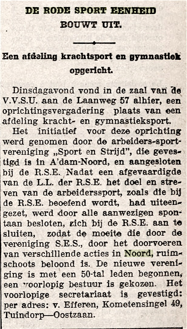 Heinz Schade war einer der vielen Deutschen, die 1933 in die Niederlande geflohen waren. Geschlagen und mit blauen Flecken übersät, kam er in Winterswijk an, wo viele politische Flüchtlinge in Groningen mit Unterstützung der Hilfe des Internationalen Roten Kreuzes die Grenze überschritten. Edith Veenhof, Kurier, spielte dabei eine wichtige Rolle. Heinz reiste weiter und kam nach Amsterdam, Amsterdam-Noord, um genau zu sein, aber er verbrachte auch einige Zeit in Rotterdam und Utrecht. Diese politischen Flüchtlinge waren weiterhin in Gefahr. Sie konnten als unerwünschte Ausländer verhaftet und nach Deutschland zurückgeschickt werden. Dies hat sich wiederholt zugetragen und einige von ihnen zahlten dafür mit ihrem Leben. Heinz kommt mit dem Kurier Edith Veenhof in Verbindung und wird 1934 glücklicher Vater eines Sohnes. In Bochum, wo er herkam, war er erfolgreicher Sportler und Meister im Ringen. In Amsterdam-Noord wurde er Gründungsmitglied der Sektion der Kraftsportler und des Gymnastiksportvereins „Sport und Kampf“, der dem R.-S.E (Roter Sportverein) angeschlossen war. Sie nutzten eine stilgelegte Fabrik im Laanweg 57 Amsterdam-Noord.