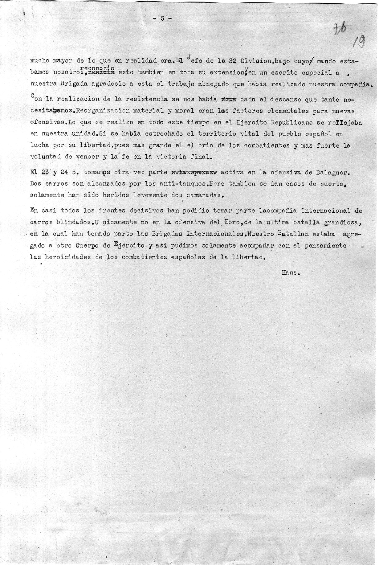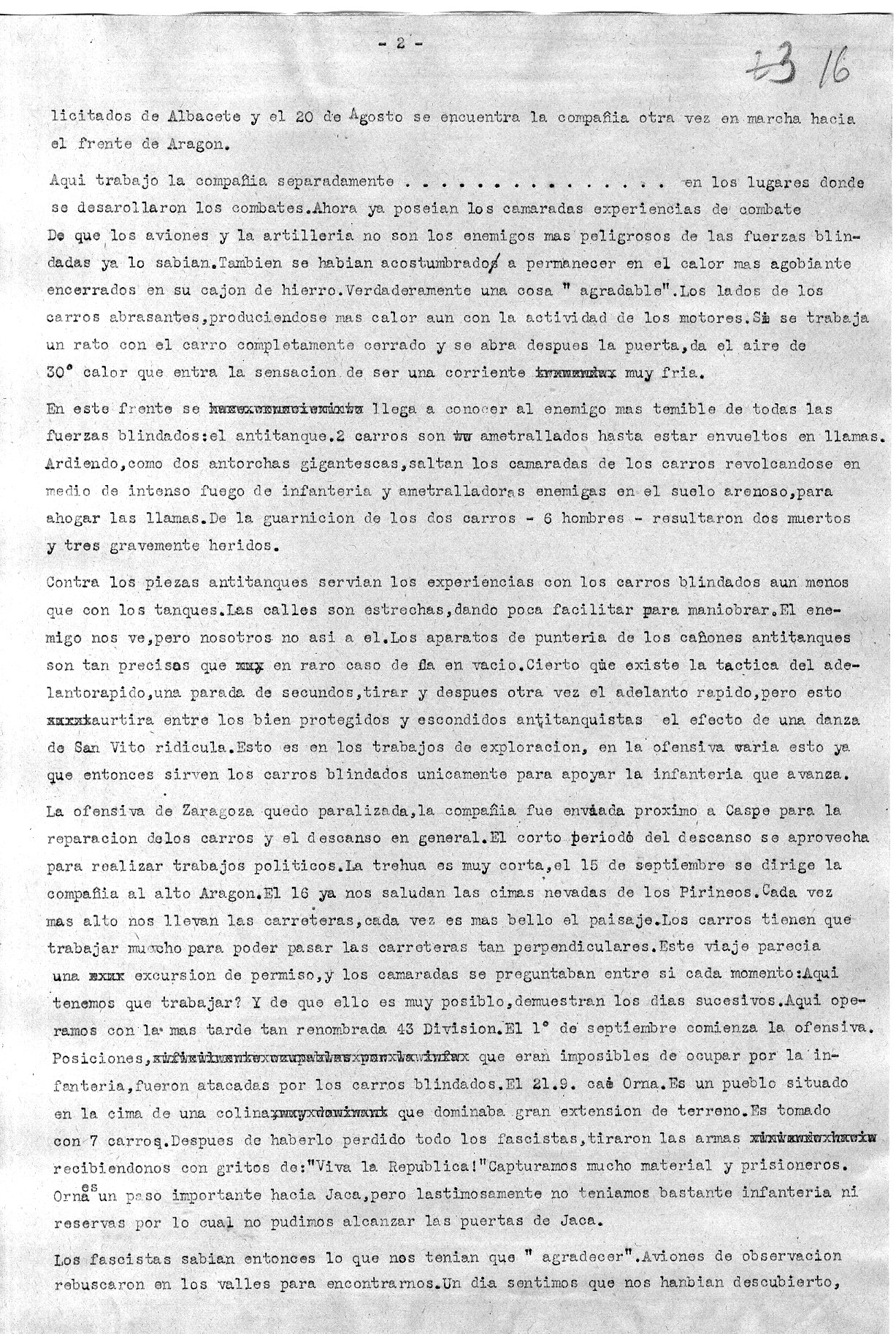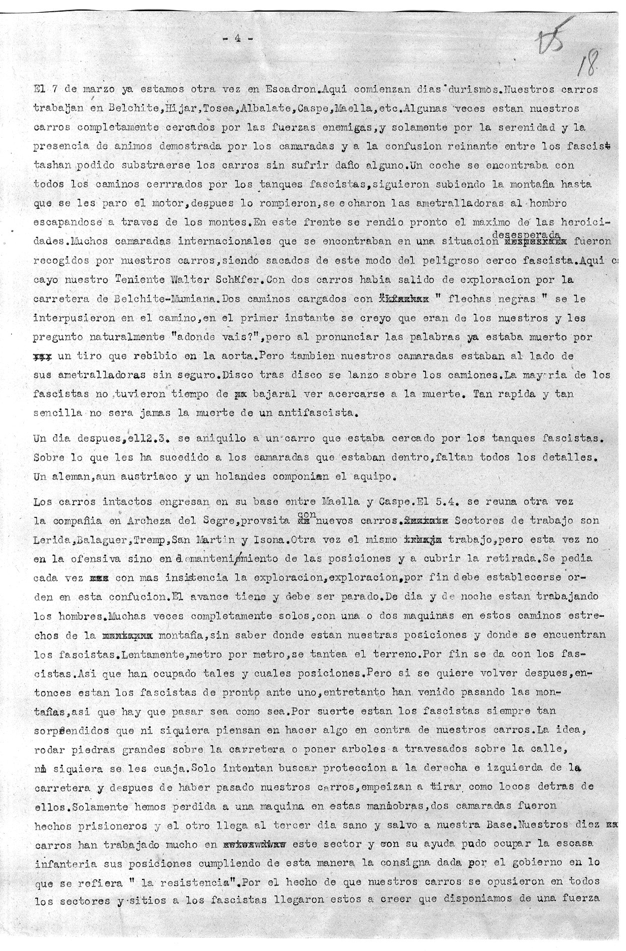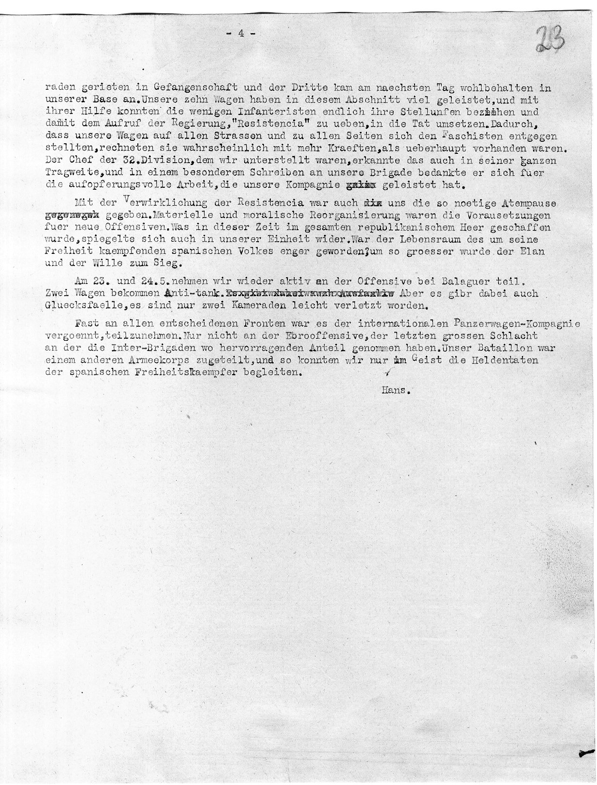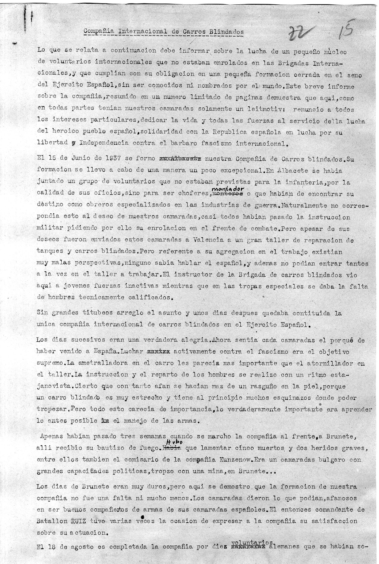 Hans Kahle schreibt im folgenden über die inzwischen völlig vergessene „Internationale Panzerwagen-Kompanie“, die eine selbständige Einheit der Spanischen Volksarmee war. Mit dem Schreiben, das auf einen von ihm gehaltenen Vortrag zurückgeht, wollte er die Leistungen dieser Kompanie würdigen, denn diese Kompanie war fast unbekannt und fand keine mediale Beachtung wie z.B. die größeren Internationalen Brigaden. Der Artikel war ursprünglich in Spanisch verfasst worden, offensichtlich haben sich dann Genossen aus dem Stab der 45. Division um eine Übersetzung bemüht.