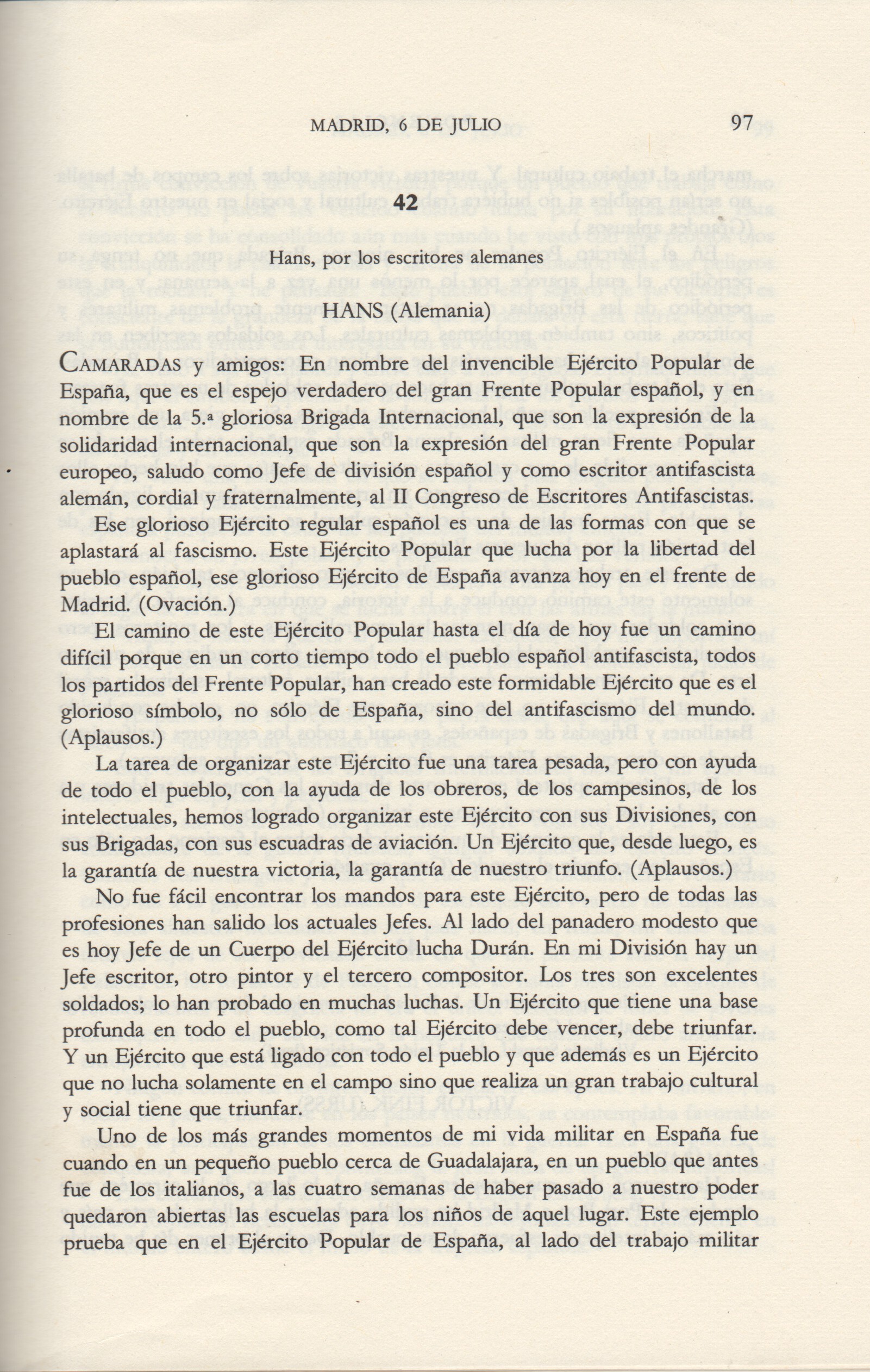 Auf diese Arbeit sind wir stolz, aber wir wissen sehr gut, dass nicht nur dieser Weg zum Siege, zum Triumph führt. Wir brauchen Soldaten, die die Maschinengewehre und die Granatwerfer bedienen können, aber wir brauchen auch Soldaten, die gute Propagandisten unserer Kunst sind. Auf diese Weise haben wir die militärische, kulturelle, geistige und moralische Grundlage unseres Heeres gelegt, und ich, der dieses Heer gut kennt, ich, der Bataillone und Brigaden von Spaniern geführt habe, ich bin hier und sage allen antifaschistischen Schriftstellern, dass dieses Heer fest und unerschütterlich ist. (großer Applaus)