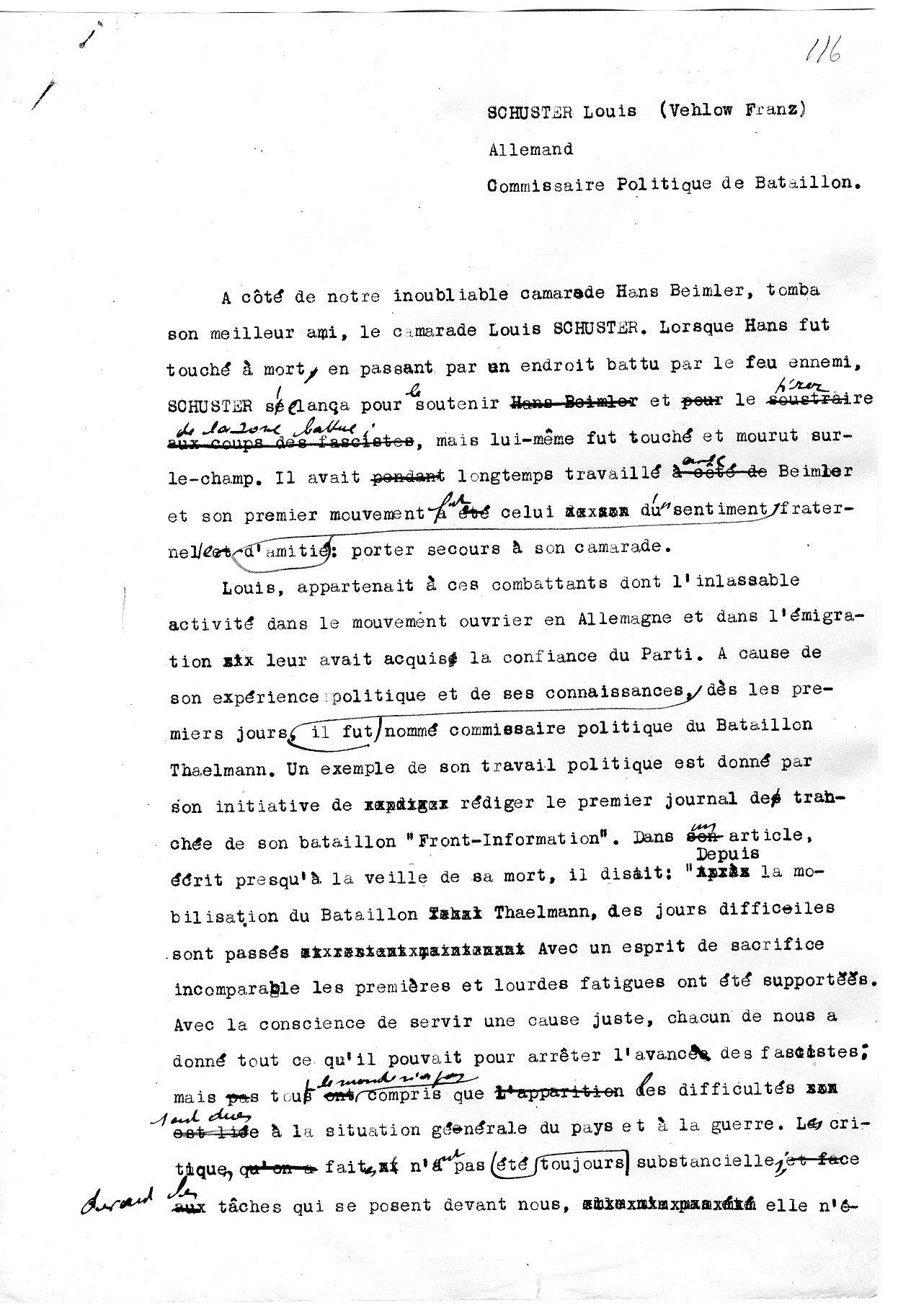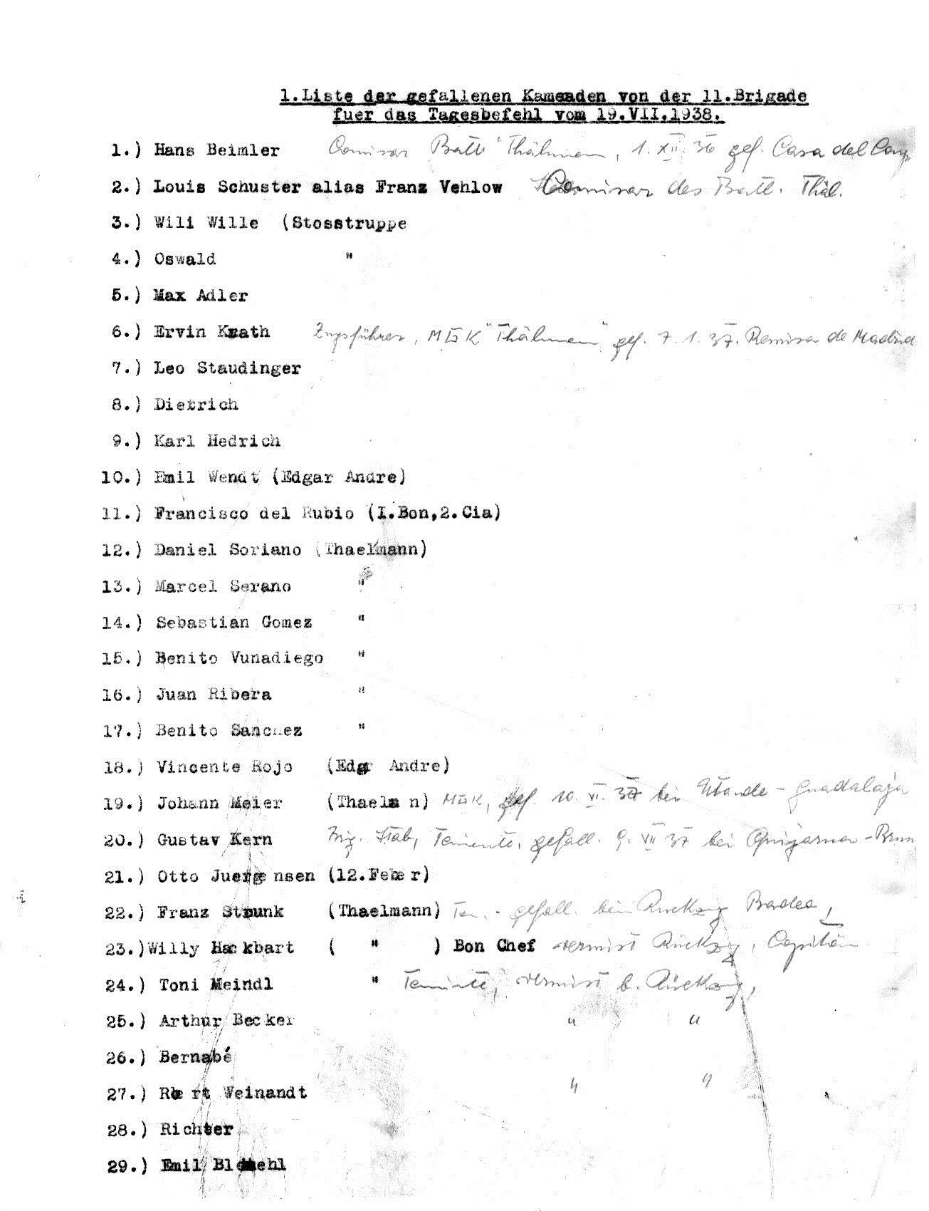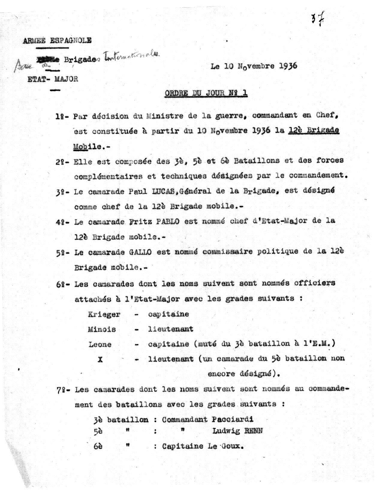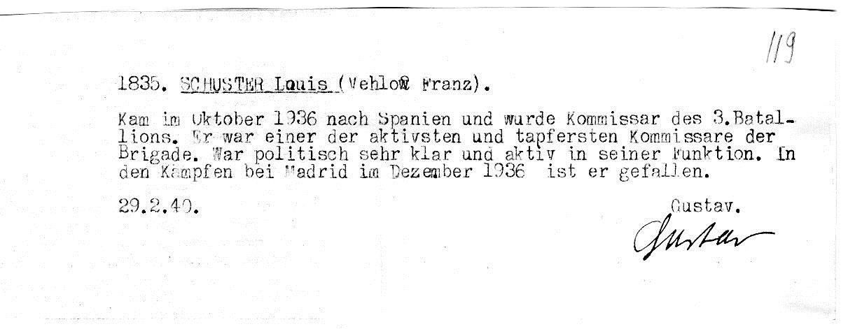 Die Ernennung Vehlows (Louis Schuster) zum Kommissar des 5. Bataillons der 12. Brigade, aus dem dann das Thälmann-Bataillon der 11. Brigade wurde. Es handelt sich um den Befehl Nr. 1 des Stabs der Base, unterzeichnet von dem ersten Kommandanten der Basse Vidal Gayman, mit dem „Louis Schuster“ zum Kommissar des 5. Bataillons der 12. Brigade ernannt wurde. Das kann aber nur eine kurzzeitige Geschichte gewesen sein – ebenso wie Ludwig Renn als Kommandeur. Das Dokument ist aus RGASPI 545-2-32.
