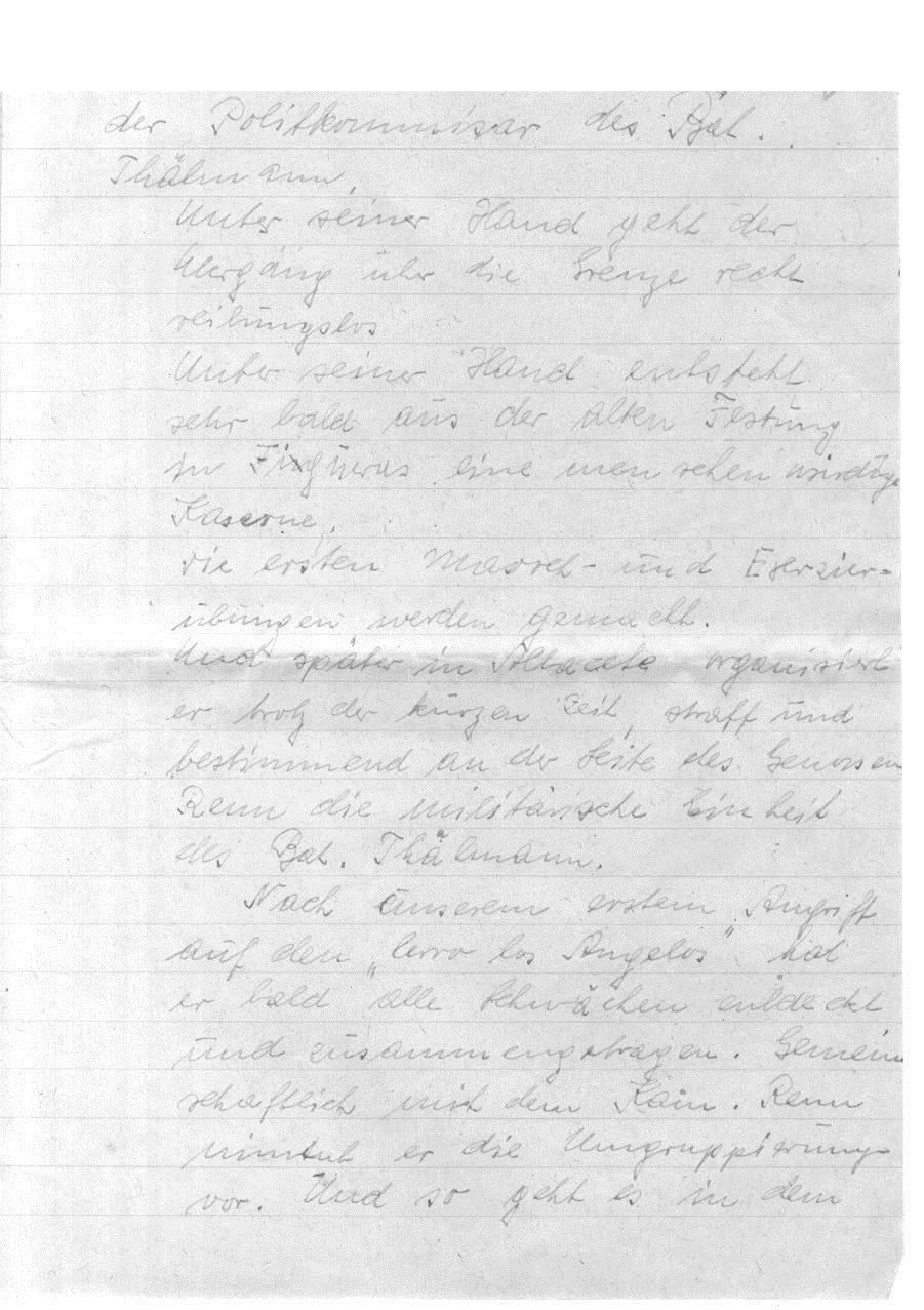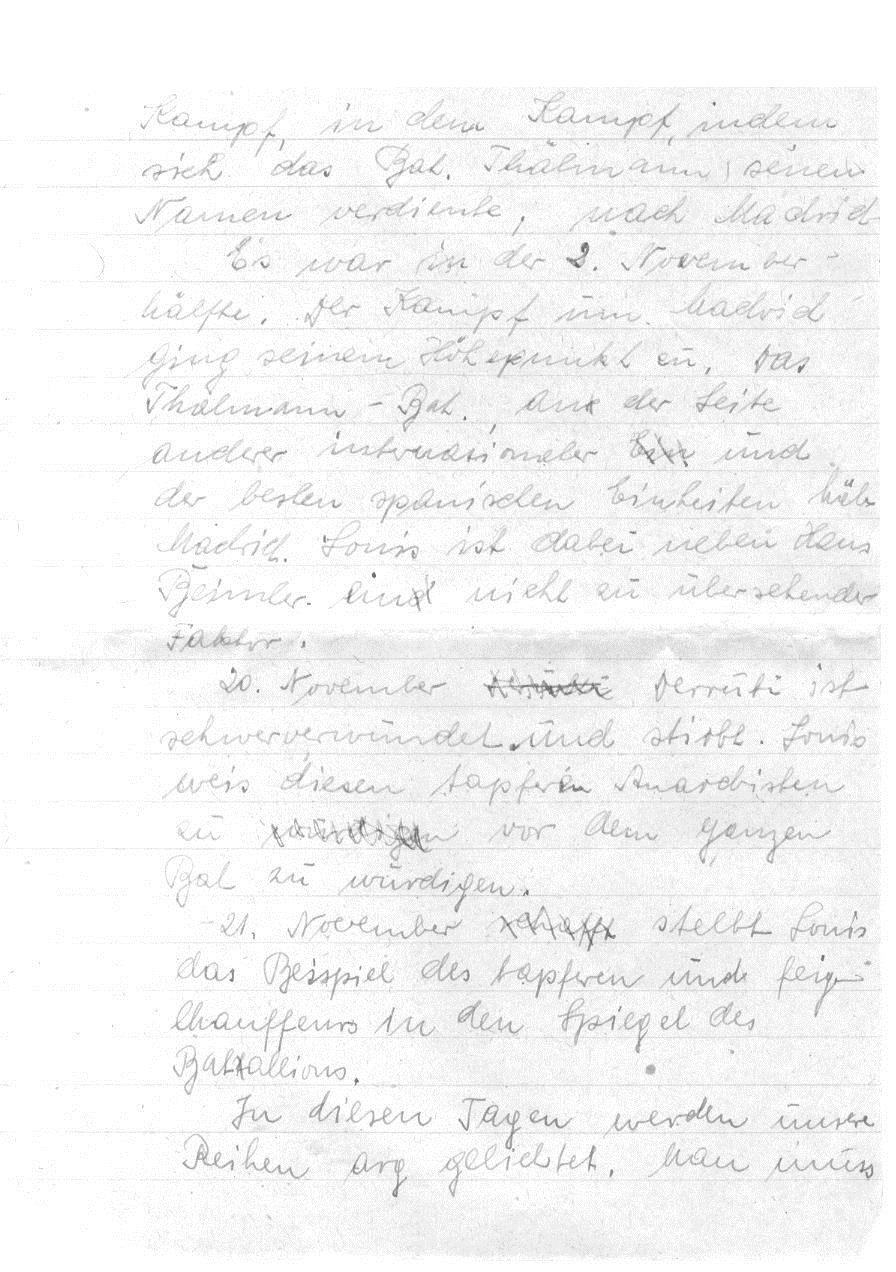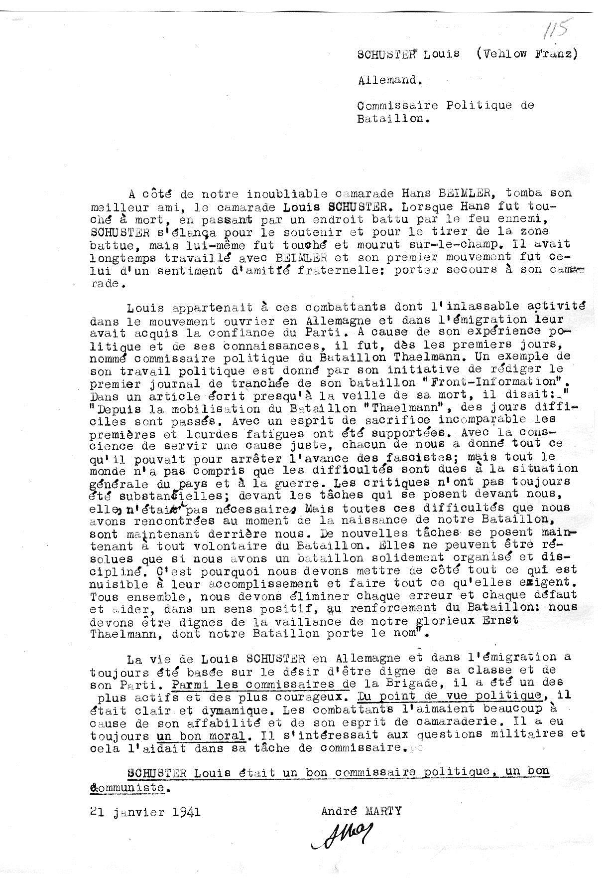 Die Ernennung Vehlows (Louis Schuster) zum Kommissar des 5. Bataillons der 12. Brigade, aus dem dann das Thälmann-Bataillon der 11. Brigade wurde. Es handelt sich um den Befehl Nr. 1 des Stabs der Base, unterzeichnet von dem ersten Kommandanten der Basse Vidal Gayman, mit dem „Louis Schuster“ zum Kommissar des 5. Bataillons der 12. Brigade ernannt wurde. Das kann aber nur eine kurzzeitige Geschichte gewesen sein – ebenso wie Ludwig Renn als Kommandeur. Das Dokument ist aus RGASPI 545-2-32.