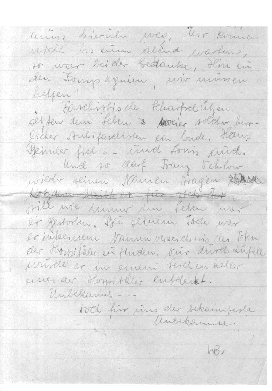 Am 11.9.2018 wird in Köln ein Stolperstein für Franz Vehlow (alias Louis Schuster, vom November 1936 bis zum 1. Dezember 1936 Kommissar des Ernst-Thälmann-Batillons der XI. Internationalen Brigade und gemeinsam mit Hans Beimler am 1. Dezember 1936 bei Madrid gefallen) verlegt. Die Redaktion veröffentlicht verschiedene Dokumente aus dem Archiv von Werner Abel, u. a. den Nachruf in den „Front-Informationen“ des Thälmann-Bataillon. Der Nachruf enthält auch die bis dato unbekannte Information, dass Franz Vehlow auf dem Friedhof von Fuencarral, einem Stadtteil (Barrio) von Madrid, beerdigt wurde.
