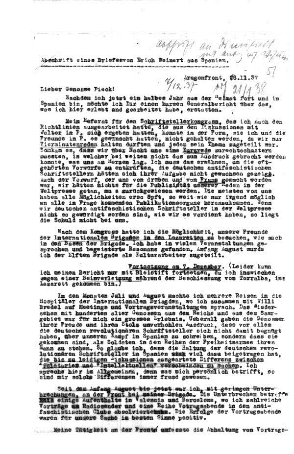 Fundstück: Generalbericht von Erich Weinert an Wilhelm Pieck, Arargonfront 1937.