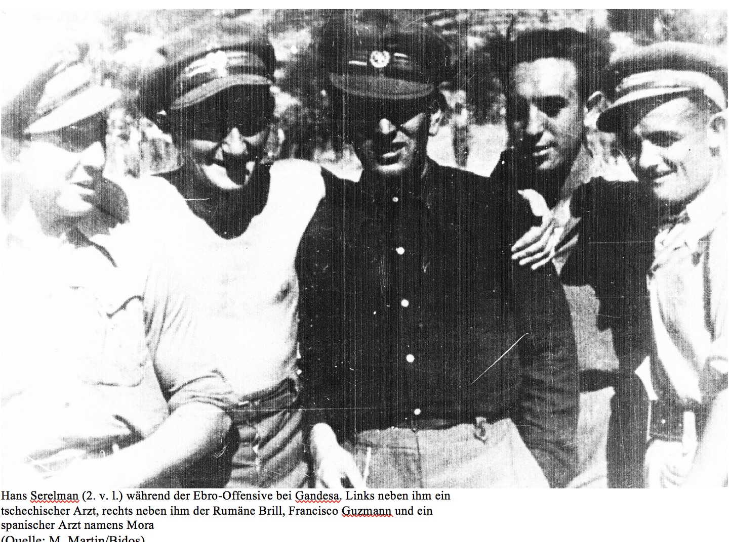 Titelfoto: Hans Serelman (2. v. l.) während der Ebro-Offensive bei Gandesa. Links neben ihm ein tschechischer Arzt, rechts neben ihm der Rumäne Brill, Francisco Guzmann und ein spanischer Arzt namens Mora (Quelle: M. Martin/Bidos)