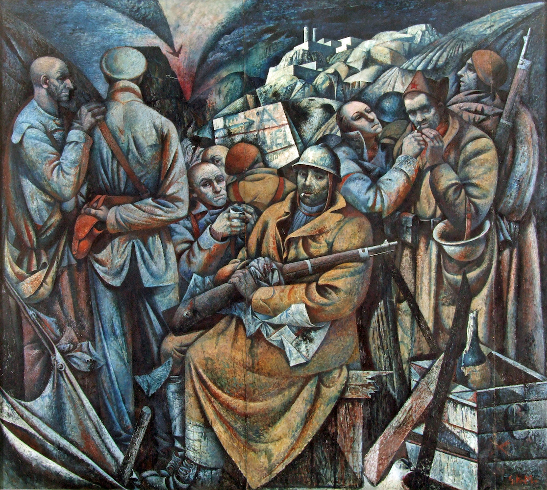 „… Mit gewachsenem Geschichtsbewußtsein und höherem künstlerischen Anspruch gestalteten Künstler wie Sitte, Heisig oder Tübke, woher wir kommen, wer wir sind, wohin wir gehen. Die sinnbildhafte Verdichtung, mit der Themen aus dem Kampf der deutschen Arbeiterbewegung oder zur Pariser Kommune gestaltet wurden, und die durch simultane u. a. Gestaltungselemente erweiterten Formsprachen deuteten darauf, daß die realistische Kunst um 1965 in eine neue Periode eintrat. Ein eindrucksvolles Historienbild schuf auch G. K.- Müller mit seinem Gemälde von Interbrigadisten. Das Sujet einer Kampfpause während der republikanischen Offensive 1937 bei Teruel wird durch die klaren Formen in ihren stilisierenden, teilweise kubistischen Momenten und durch die Beschränkung auf blaue und braune Farbtöne ins Statuarische und Monumentale gesteigert. …“ [Dr. sc. Peter Arlt, DLZ/8, 1989, Berlin/DDR]