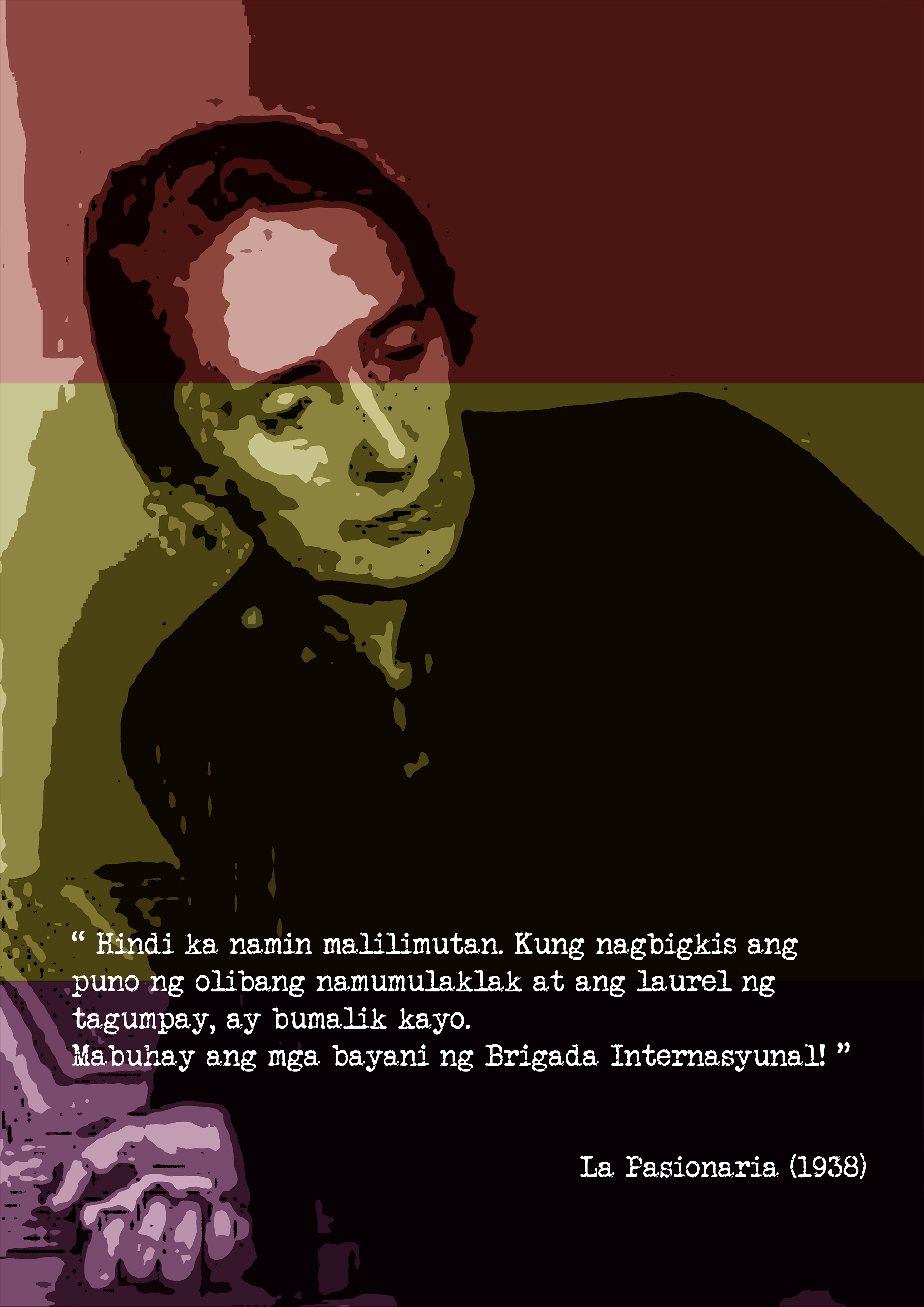 - Filipino Plakat in 38 Sprachen mit dem „Ruf der Pasionaria 1938“ – Verabschiedung der Internationalen Brigaden aus Spanien vor 80 Jahren. Grafik: Manel Montero. Projekt: Hans-Jürgen Schwebke. 12. November 2018.