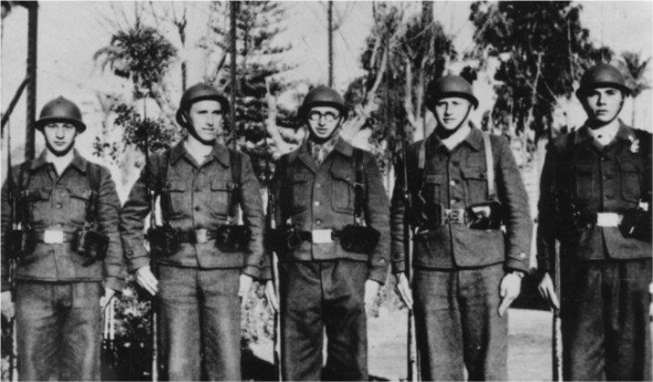 Bild 1: Spanienkämpfer aus Chemnitz 1937 in einem Ausbildungslager der XI. Internationalen Brigade in Madrigueras. Von links: Fritz Baumgärtel, Otto Kreutzmann, Werner Kinzl, Kurt Höfer, Walter Janka. Foto: unbekannt