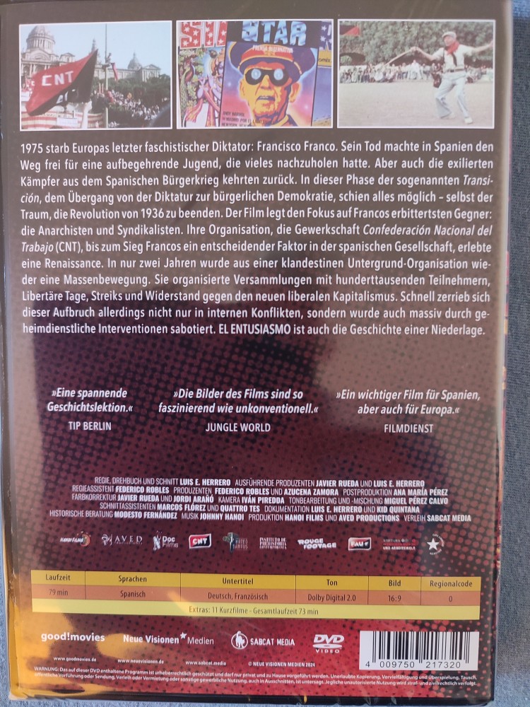 DVD In der Phase der sogenannten Transición in Spanien, dem Übergang von der Diktatur zur bürgerlichen Demokratie, schien alles möglich – selbst der Traum, die Revolution von 1936 zu beenden. Der Dokumentarfilm EL ENTUSIASMO (2018) legt den Fokus auf Francos erbittertsten Gegner: die Anarchisten und Syndikalisten.
