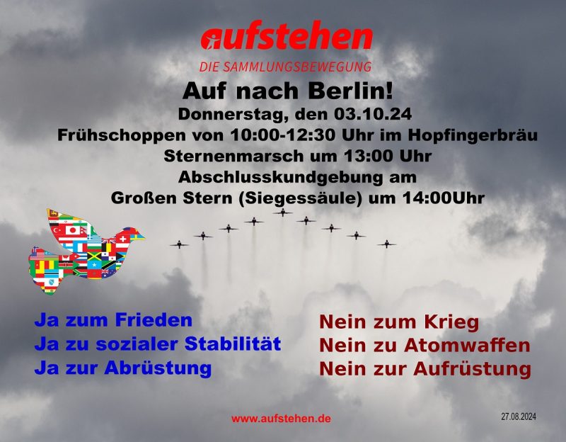 Waffen schaffen keinen Frieden! Nur mit einem Waffenstillstand können diplomatische Gespräche stattfinden. Das endlose töten muss aufhören, ob in der Ukraine oder im Gaza Konflikt! Wir alle Fragen uns wie denn eine Lösung hin zum Frieden aussehen könnte. Habt ihr Vorschläge, dann schreibt andialog@aufstehen.deLink: Einladung Flyer der Sammlungsbewegungaufstehen https://nextcloud.aufstehen.de/nextcloud/index.php/s/6qe8DtgfitL8ZR2 * aufstehen-Frühschoppen und Treffpunkt Wir laden zum „Frühschoppen“ am 3. Oktober 2024 (Donnerstag) in Berlin von 10.00 bis 12.30 Uhr in die Gaststätte „Hopfinger Bräu“ zumThema „Sammlungsbewegungaufstehen– eine außerparlamentarische Alternative:Partei „Bündnis Sahra Wagenknecht – für Vernunft und Gerechtigkeit“ (BSW) – eine politische Alternative zur Bundestagswahl“ ein. * 4. Info-Brief für den 3. Oktober 2024 in Berlin https://nie-wieder-krieg.org/2024/09/11/rundbrief-4-redner-ablauf-03-10-24/