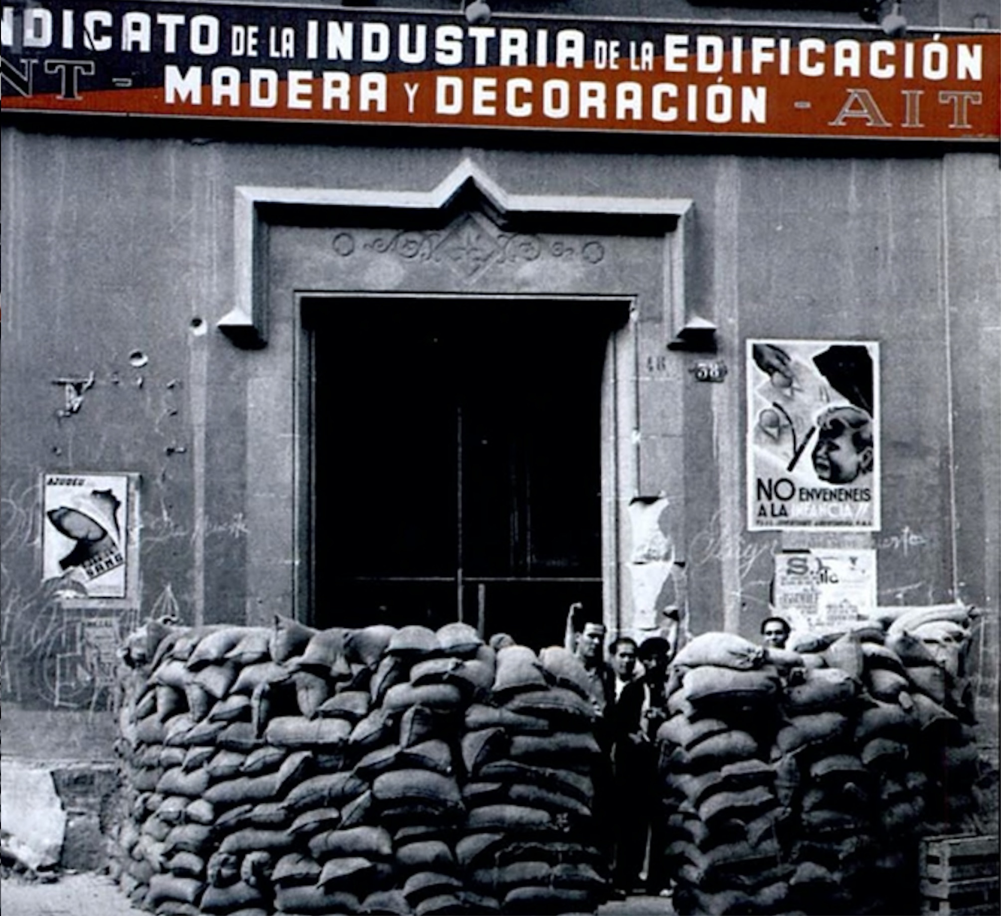 „Verbarrikadiertes Gebäude der CNT, Sektion Bau, Holz, Farben“. Quelle: Ferran Gallego, Barcelona, mayo de 1937.